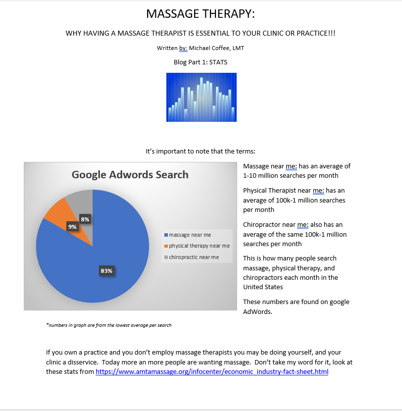 Massage Therapy is a growing industry. It’s in demand these days, and a clinic owner would be remiss if they didn’t capitalize on this addition for their prospective clinics. Not only is massage therapy a fast growing field, there are some studies that show that massage therapy can help relax, reduce stress, and even help with your patients managing pain, which can be a great adjunct while getting off of opiod drugs. This is something that can definitely help with your clinic by adding value to your current and prospective patients. More and more people are seeking massage. With the decline in GP’s as more and more graduates elect to move towards the more lucrative specialties, CAM (complimentary and alternative medicine) therapies, as well as manual therapies like Physical Therapy, are becoming more in demand. Part one of this blog is designed to help highlight the popularity, and by-the-numbers evidence on the growing popularity and demand for massage therapists. The stats below will help shed some light on what I am suggesting. By having a massage therapist employed in your clinic, you can increase visibility online, especially when trying to improve SEO’s and having your clinic on the top of google searches. Below is an example of how, just the term massage, will help guide people to your website, and make it easier for your business to be seen.